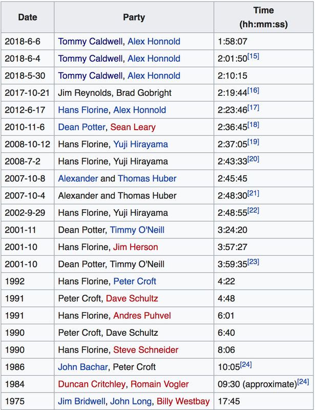 The Nose為美國優聖美地酋長岩最熱門的大岩壁線路,一般人以大牆攀登的方式約要4-5日。早期,曾有少數香港攀岩先驅前往美國攀爬The Nose完成大岩壁的夢想。平常人要4-5天的時間才能完成,而Tommy Caldwell和Alex Honnold竟然以2小時以內速攀完成,不敢想像啊!